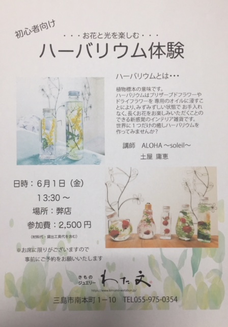 植物標本の意味です。 ハーバリウムはプリザーブドフラワーや ドライフラワーを 専用のオイルに浸すこ とにより、みずみずしい状態で お手入れ なく、長くお花をお楽しみいただくことの できる新感覚のインテリア雑貨です。 世界に1つだけの癒しハーバリウムを 作ってみませんか? |